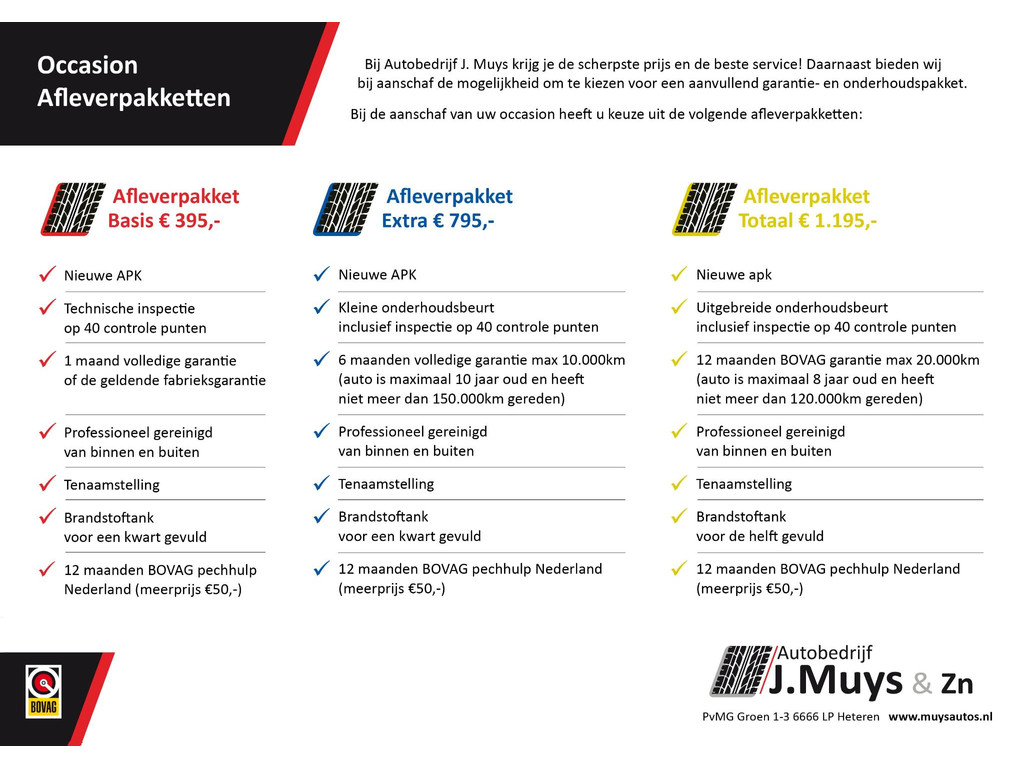 Wij leveren de auto graag naar uw wensen af, daarom heeft u bij ons de keuze uit diverse afleverpakketten. Onze verkopers kunnen u adviseren welk afleveringspakket het beste op uw wensen aansluit. Meer informatie hierover kunt u vinden op onze website, www.muysautos.nl