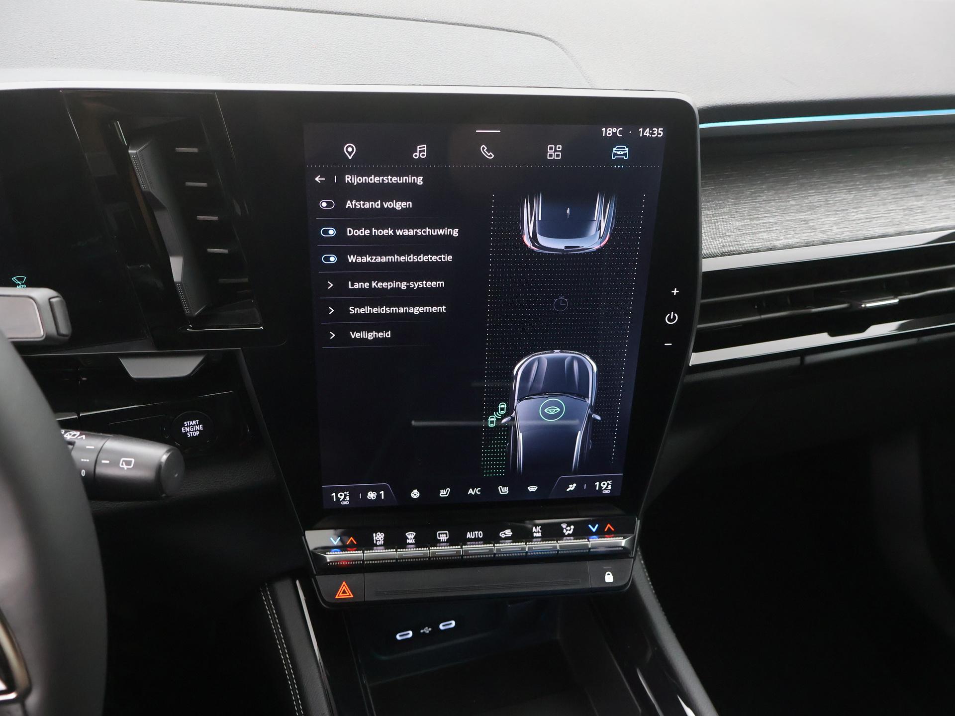 Zoals u mag verwachten van deze Renault Austral is hij uitgerust met een reeks aan actieve veiligheidssystemen. In het instrumentarium laat de verkeersborddetectie de actuele verkeersborden zien. Het Lane-keeping systeem zorgt voor een automatisch constante positie binnen de rijstrook. Afdwalen is uitgesloten. Deze auto heeft actieve dodehoekdetectie. Dit veiligheidssysteem helpt u om aanrijdingen te voorkomen. Ook helpen het forward collision warning system, hill hold functie, brake assist, vermoeidheidsherkenning en bandenspanning controlesysteem, uw rit tot een veilige rit te maken.