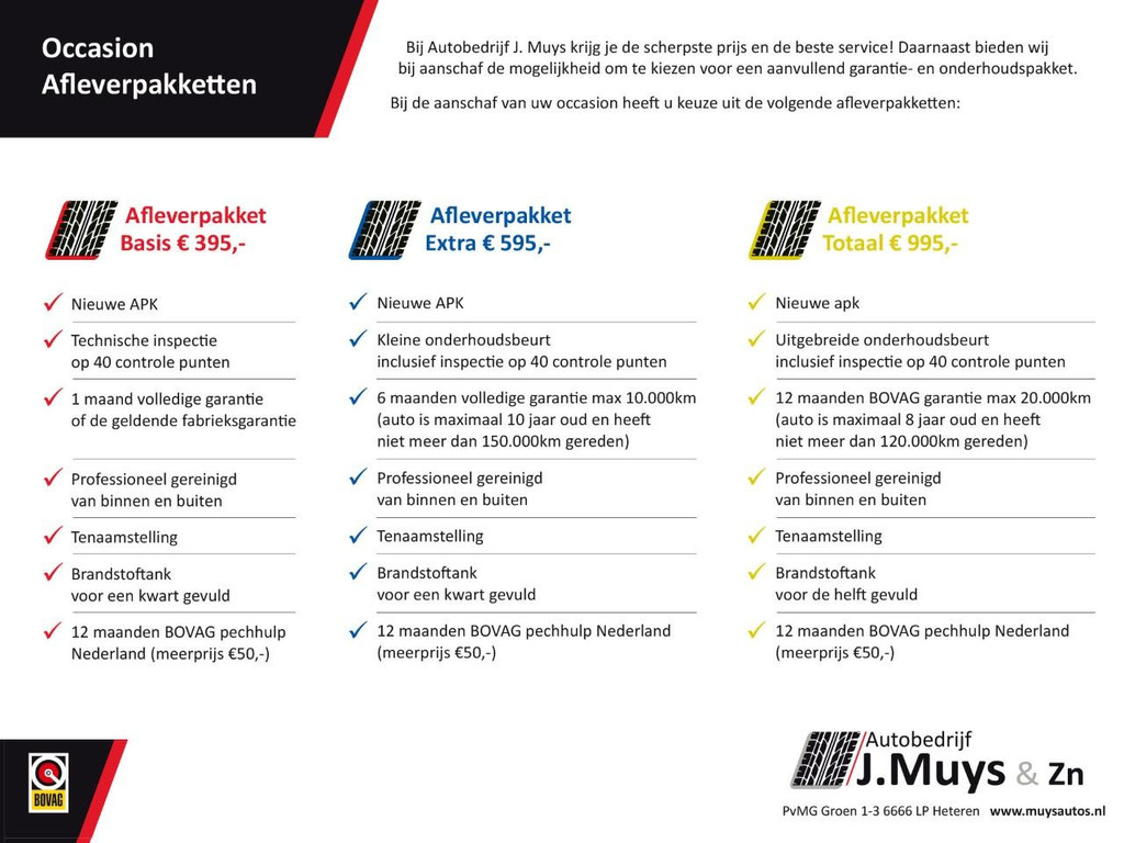 Wij leveren de auto graag naar uw wensen af, daarom heeft u bij ons de keuze uit diverse afleverpakketten. Onze verkopers kunnen u adviseren welk afleveringspakket het beste op uw wensen aansluit. Meer informatie hierover kunt u vinden op onze website, www.muysautos.nl