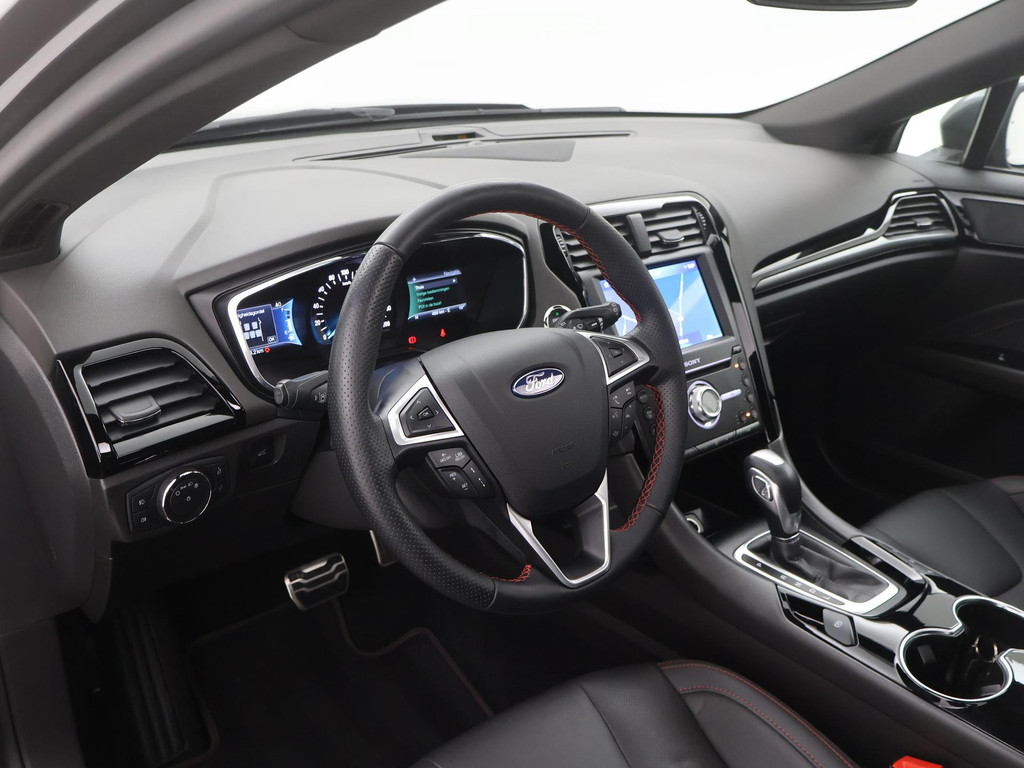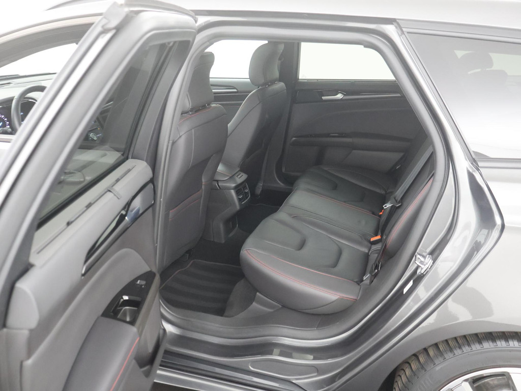Dat u het milieu wilt sparen, wil nog niet zeggen dat u aan rijcomfort moet inleveren. De Ford Mondeo Wagon is een comfortabele en ruime hybride auto. Elektrisch rijden: zuinig, goedkoop en schoon. Maar soms net wat beperkt als het gaat om afstand. Daarom heeft deze hybride Ford Mondeo Wagon zowel een verbrandingsmotor als een elektromotor. Als dat geen perfecte combi is! Het lederen interieur geeft deze auto luxe en klasse. In dit voertuig hoeft u nooit meer kou te lijden dankzij functies als stoelverwarming en verwarmbare achterbank, evenals een verwarmbaar stuur. Ziet er goed uit, die sportstoelen. Maar waar het om gaat, is de solide zit onder alle omstandigheden. Dat noemen ze nou een ruimtelijk effect: het elektrisch bediende glazen panoramadak. Met een druk op de knop gaat de elektrische achterklep open. U wordt in deze auto ook getrakteerd op 18 inch lichtmetalen velgen, LED koplampen, sportonderstel, donker getint glas achter, in delen neerklapbare achterbank en LED-achterlichten. Gaat u graag met de fietsendrager op pad, dan is de trekhaak een praktische extra.